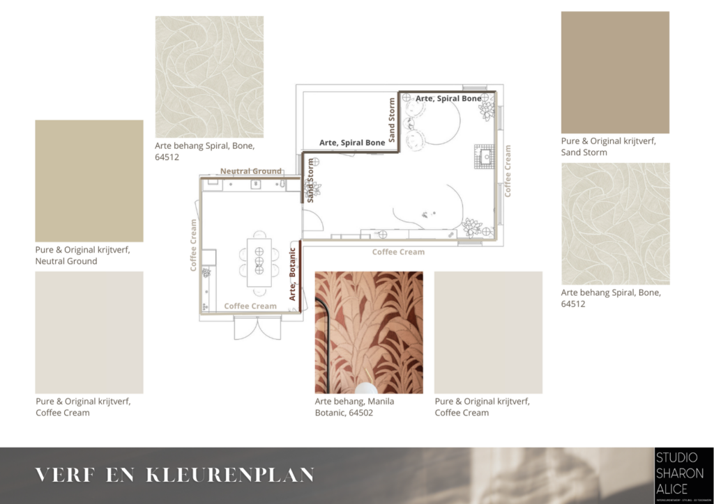In dit interieuradvies heb ik de ruimtes samengebracht met de warme tinten van Pure & Original. De combinatie met het Arte behang zorgt voor een spannende combinatie van structuren waarbij de tinten perfect bij elkaar matchen. De terracotta tint zorgt voor een warme accent kleur. Deze wordt weer doorgetrokken in het behang in de keuken.